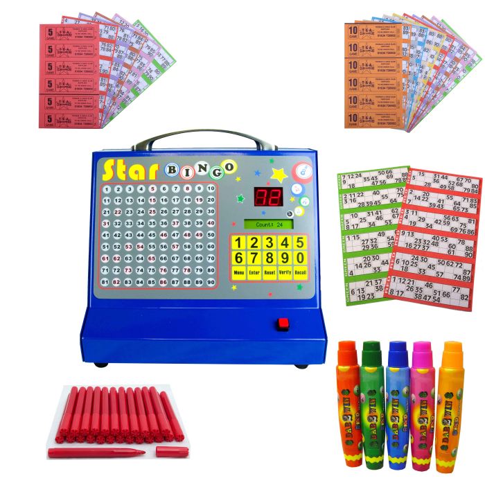 The Bingo Starter Kit with the Star Bingo Machine is truly everything you will need for your bingo night on a professional basis. Weather its for a Pub, Club, Village Hall, school, church or residential homes all your equipment is included: